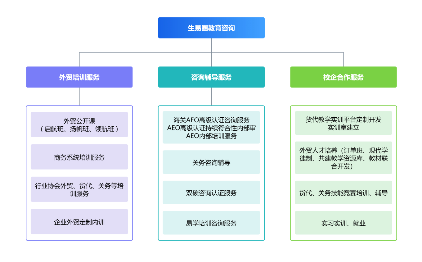 公司結(jié)合國際供應鏈外貿(mào)綜合服務及人才優(yōu)勢,立足外向型企業(yè)人才需求,成立湖南生易圈教育咨詢有限公司。